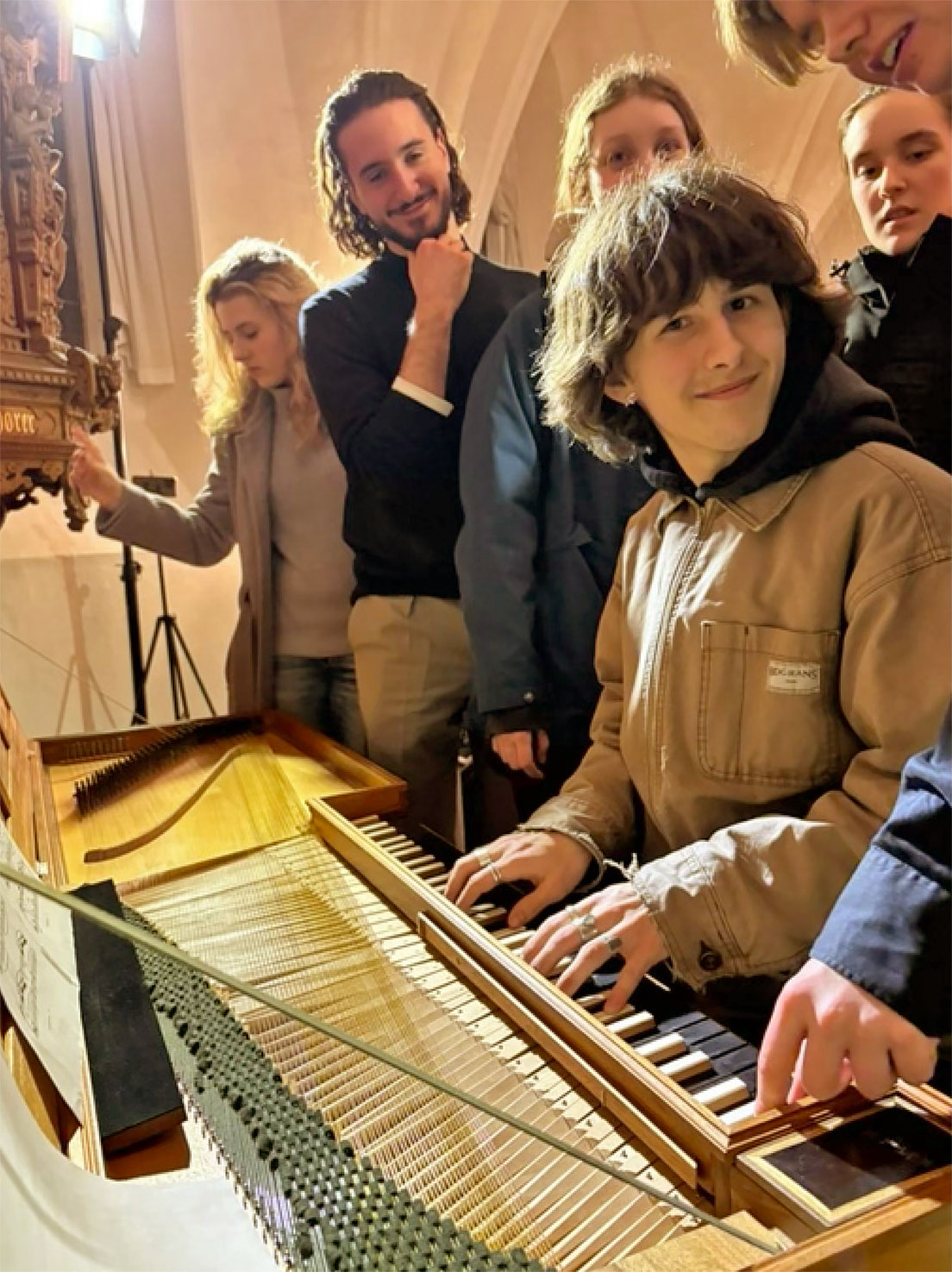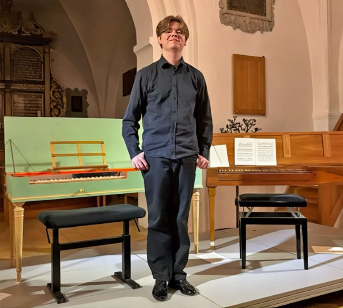 Zunächst spielte Julius auf dem kleinen Clavichord von Dick Verwolf, dann auf dem Clavichord nach Tannenberg. Mit großer Spannung warteten alle auf das Pantalon-Clavichord. Die Zuhörer waren wie gebannt von diesem unerwarteten Klang, der dann kam, dem Klangreichtum und den Möglichkeiten zu differenzieren und noch sehr leise, aber hörbar zu spielen. Nach dem Konzert wurde Julius zu Recht gefeiert, auch von seinen Freunden. Eine Zuhörerin meinte: „Ich wusste gar nicht, dass man so leise spielen kann.“