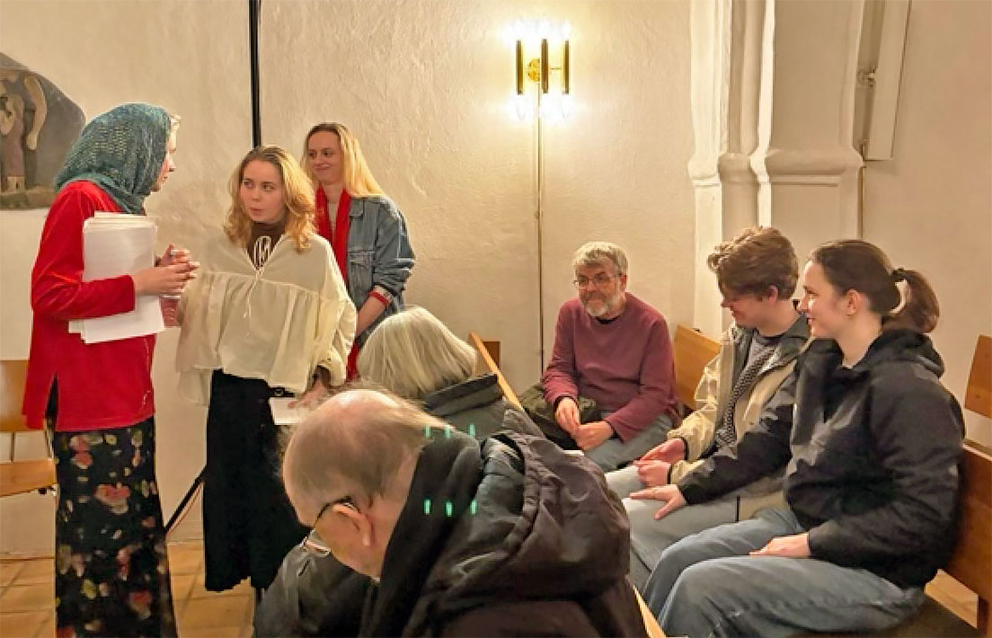 Am Samstag lud Mads Damlund zu einem Meisterkurs in das an die Kirche angrenzende Gemeindehaus ein. Fünf Spieler und Spielerinnen hatten Stücke mitgebracht. Mads besprach mit ihnen Einzelheiten zur Armhaltung, zum Anschlag aus dem Arm heraus, das schnelle Spielen mit dieser Technik, das Überlegato. Ziel war es, Gewicht in allen Tönen zu legen, um einen schönen Klang auf dem Clavichord zu erzeugen. Ähnliches gilt für Triller. Der Fingersatz unterstützt die Artikulation. Zum Abschluss einige gab er einige Hinweise zum Umgang mit Nervosität beim Spiel vor Publikum.