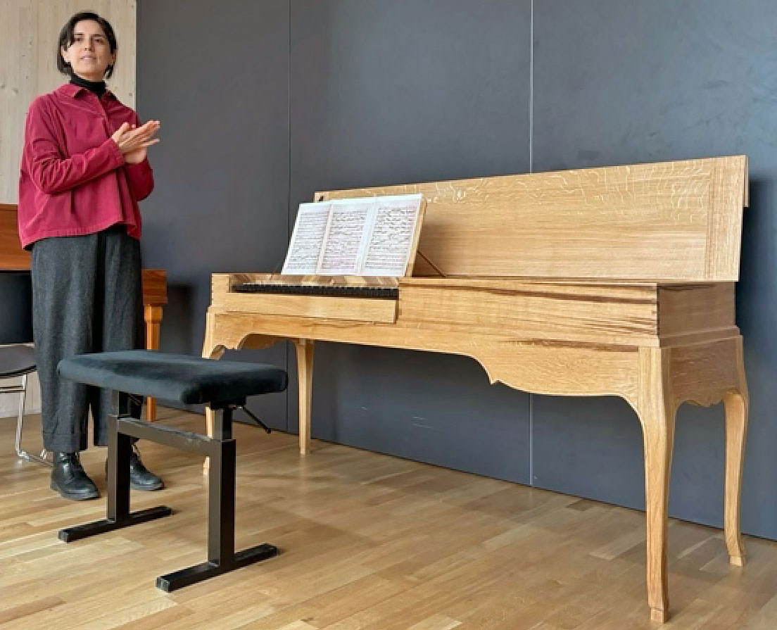 - Das Clavichord von Hornung & Møller steht im Conservatorium Copenhagen. Gebaut ist das Instrument mit Elementen aus verschiedenen anderen Instrumenten. Valentina spielte ein Larghetto in G-dur von Bendix Friedrich Zinck (1743–1801).
