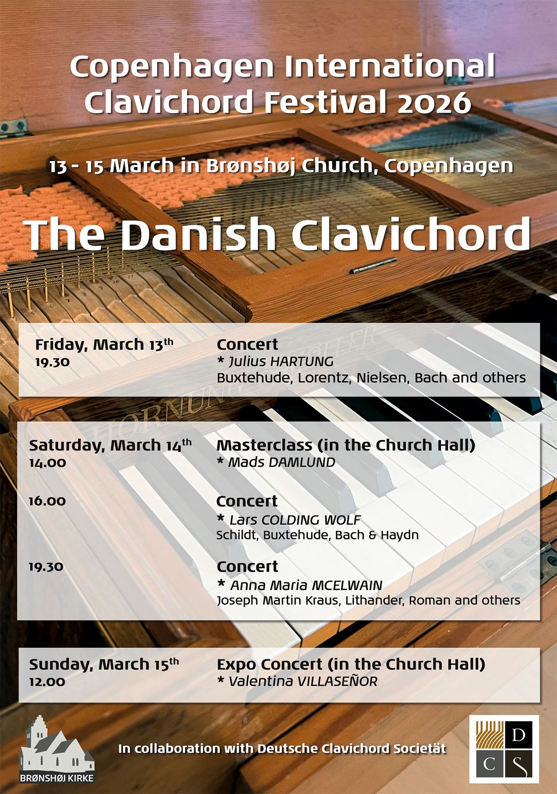 Das Eröffnungskonzert am Freitagabend spielte Julius Hartung. Er besucht die Musik-orientierte Schule Sankt Annæ Gymnasium mit den Hauptinstrumenten Orgel, Cembalo und Clavichord, Lehrer sind Leif Meyer und Mads Damlund. Er hat ein Clavichord von Dick Verwolf und ist aktueller Stipendiat der DCS.