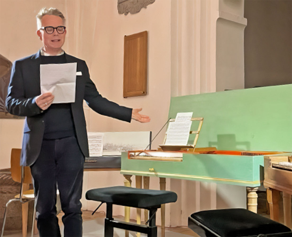 An diesem Abend spielte sie auf dem Clavichord nach Tannenberg und dem Pantalon-Clavichord. Wir hörten eine Reihe von schwedischen Komponisten: eine Sonate G-dur von Johan Helmich Roman (1694–1758), eine Sonate in C-dur von Hinrich Philip Johnsen (1717–1779), eine Sonate in Es-dur von Joseph Martin Kraus (1745–1792), dann hörten wir von Jean Sibelius (1865–1957) die „Cinq Morceaux“ (gespielt auf dem Pantalon, eine ganz ungewöhnliche Hörerfahrung!) und ein Capricio von Carl Ludwig Lithander (1773–1843). Das Konzert überraschte mit vielen uns unbekannten Komponisten, einer Vielfalt an Klängen durch die Möglichkeiten der beiden Instrumente und die großartige Spielweise von Anna Maria.