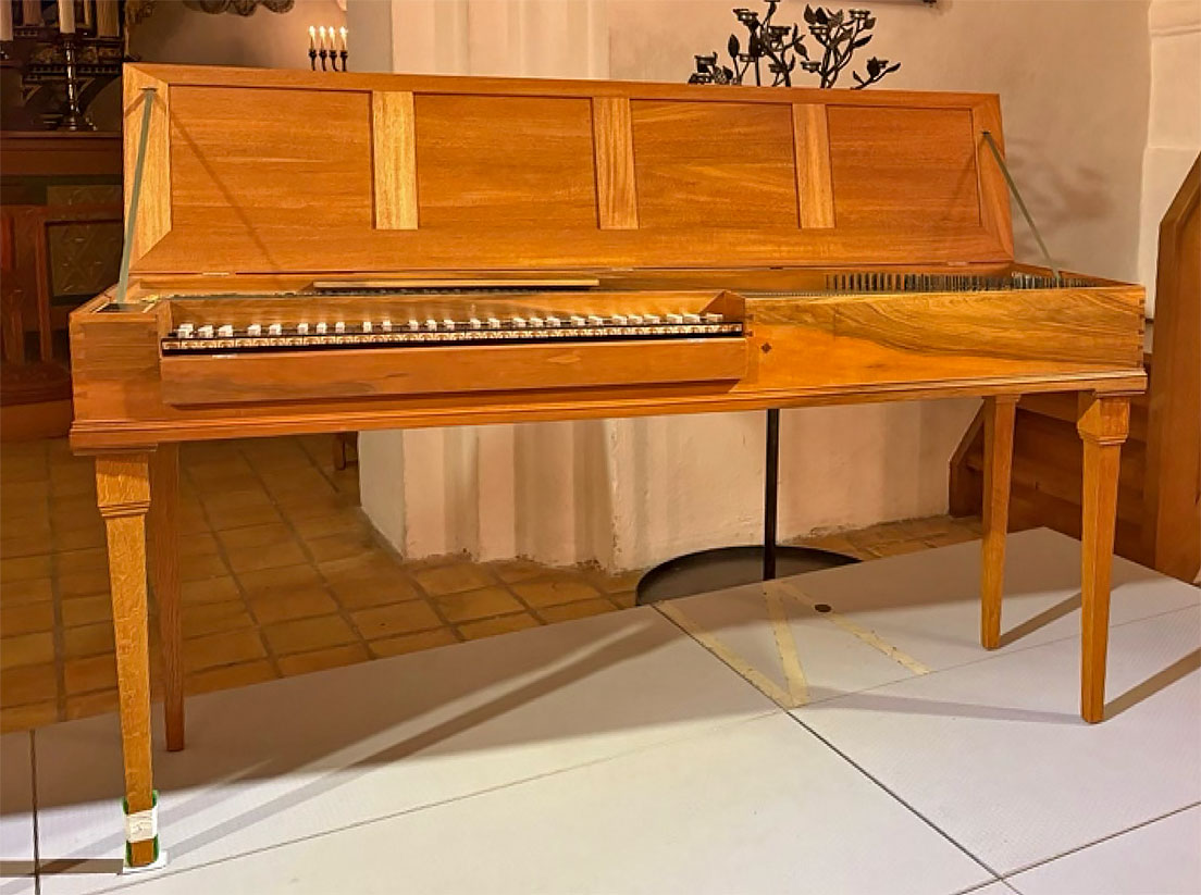 - Pantalon-Clavichord nach Magnus Christensen (ca. 1729–1766) von 1759, C–f3, bundfrei. Nachbau von Martin Kather 2026. Beschreibung siehe Absatz weiter oben.